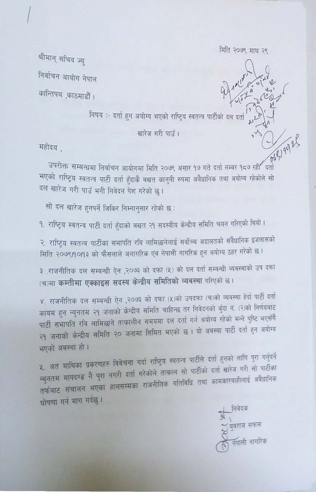 राष्ट्रिय स्वतन्त्र पार्टी दर्ता हुँदाकै बखत कानुनी रूपमा अवैधानिक तथा अयोग्य रहेको दाबी गर्दै युवराज सफलले आयोगमा निवेदन दर्ता गराएका हुन् ।