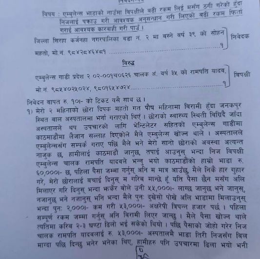 जनकपुरधाम, ९ चैत । एम्बुलेन्स भाडाको नाममा बढी रकम लिएर ठगी गरेको भन्दै चालकलाई पक्राउ गरी कारवाहीको माग गर्दै जिल्ला प्रहरी कार्यालय धनुषामा उजुरी दिइएको छ ।