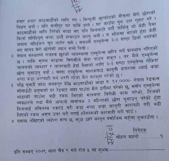 सोहनले आफ्नो निवेदनमा भनेका छन्, ‘म त्यतिबेला शोकमा हुँदा केही जवाफ नदिइ चुप लागेर बसे । तर, एम्बुलेन्सले २–३ घण्टा ढिलो नगरेको भए सायद मेरो छोराको ज्यान बच्ने थियो । नेपाल सरकारले राजश्व छुटको व्यवस्थामा एम्बुलेन्स खरिद गर्ने प्रावधान गरेको छ । ताकि सुलभ भाडामा विरामीले सेवा पाउन सकुन । तर, मैले एम्बुलेन्स चालकको व्यवहार र लापरवाही हेर्दा पैसाको लागि उनले २–३ घण्टा एम्बुलेन्स रोकेर राख्दा मैले मेरो छोरा गुमाउनु पर्यो । यस्ता एम्बुलेन्स चालकलाई कानूनी दायरामा ल्याई कडा भन्दा कडा कारवाही गर्न जरुरी रहेको मैले महशुस गरेको छु ।’