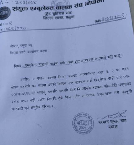 यता, संयुक्त एम्बुलेन्स चालक संघ नेपाल जिल्ला शाखा धनुषाले पनि एम्बुलेन्स भाडाको नाममा चालक रामपतिले ठगी गरेकोले आवश्यक कारवाहीको माग गरेको छ ।