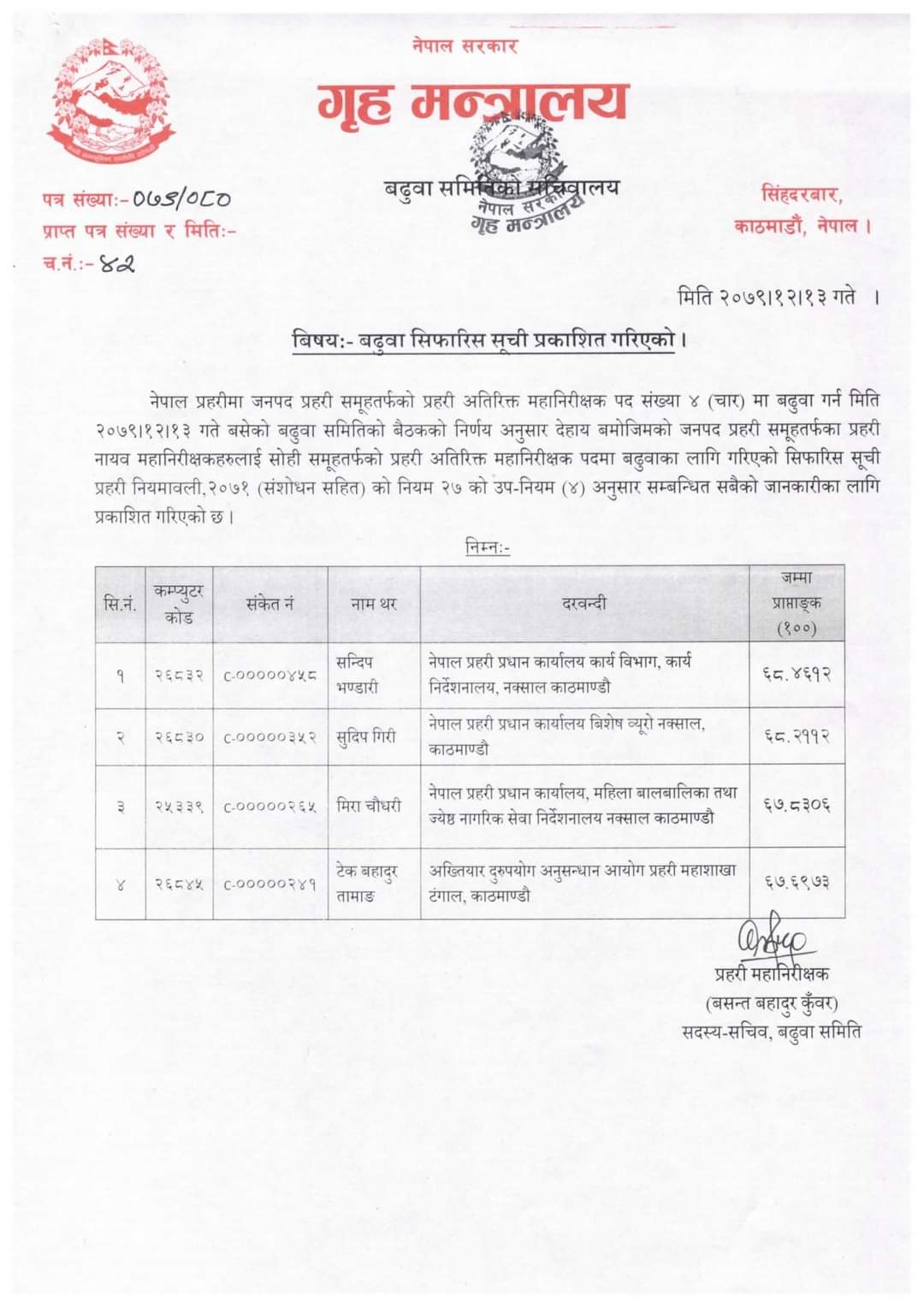 सोमबार मन्त्रालयमा बसेको बढुवा समितिको बैठकले डीआईजीहरू सन्दिप भण्डारी, सुदिप गिरी, मिरा चौधरी र टेकबहादुर तामाङ एआईजीमा बढुवाका लागि सिफारिस गरेको हो ।