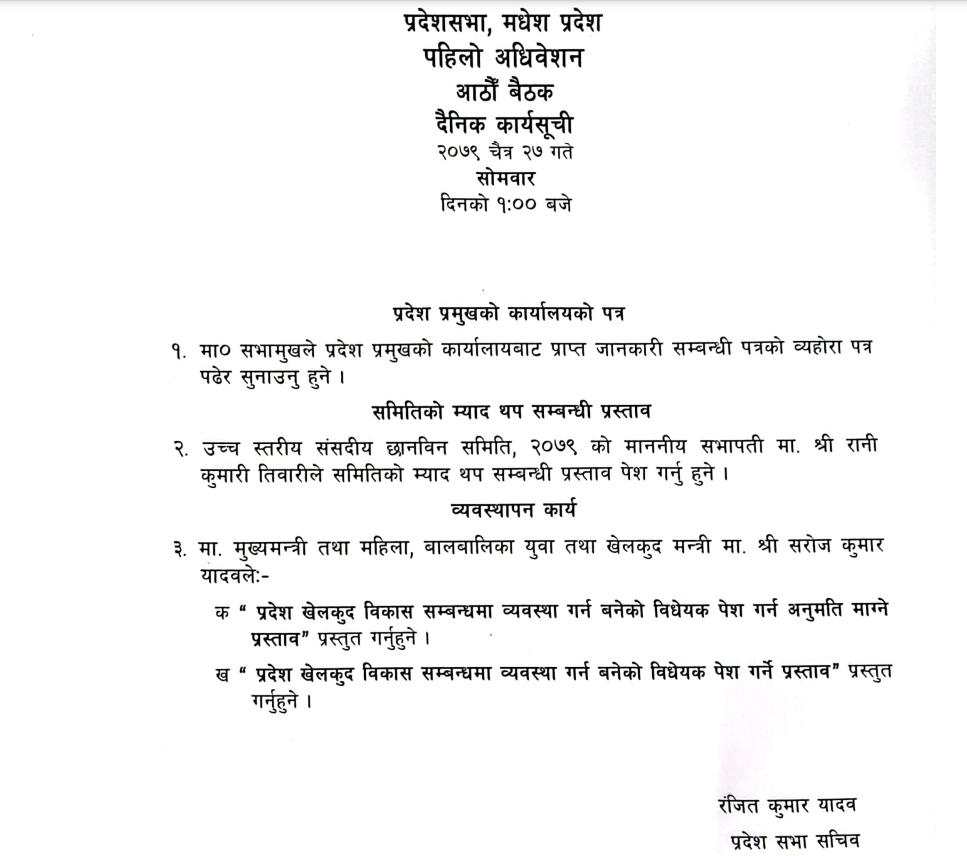 मुख्यमन्त्री सरोजकुमार यादवले प्रदेश खेलकुद विकास सम्बन्धमा व्यवस्था गर्न बनेको विधेयक पेश गर्न अनुमति माग्ने प्रस्ताव प्रस्तुत गर्नुका साथै प्रदेश खेलकुद विकास सम्बन्धमा व्यवस्था गर्न बनेको विधेयक पेश गर्ने प्रस्तावसमेत प्रस्तुत गर्ने छन् ।