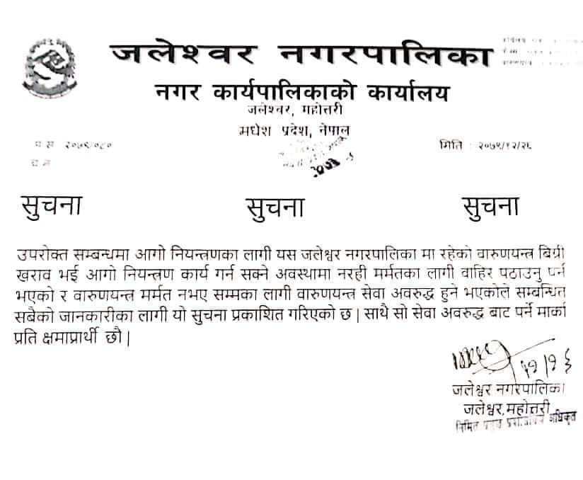उनले सो बारुण यन्त्र मरम्मतका लागि बाहिर पठाउनुपर्ने भएकोले मरम्मत नभएसम्मका लागि सेवा अवरुद्ध रहने कुरा सूचनामा उल्लेख गरेका छन् ।