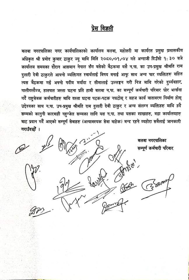 उपप्रमुख रामदुलारी देवी ठाकुरले प्रमुख प्रशासकीय अधिकृत प्रमोद कुमार ठाकुरमाथि गरेको हातपातको विरोधमा कर्मचारीहरु कामकाज ठप्प गरेका हुन् ।