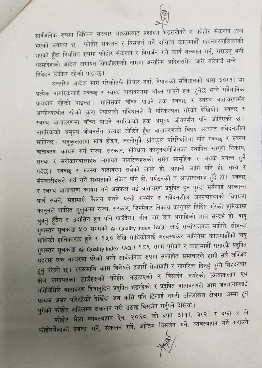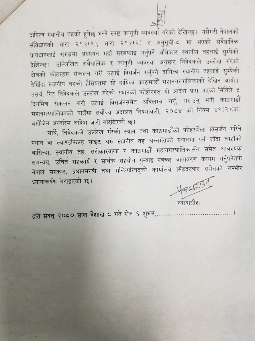 काठमाडौं, ८ बैशाख । सर्वोच्च अदालतले सिंहदरबारको फोहोर उठाउन काठमाडौं महानगरपालिकालाई आदेश दिएको छ ।