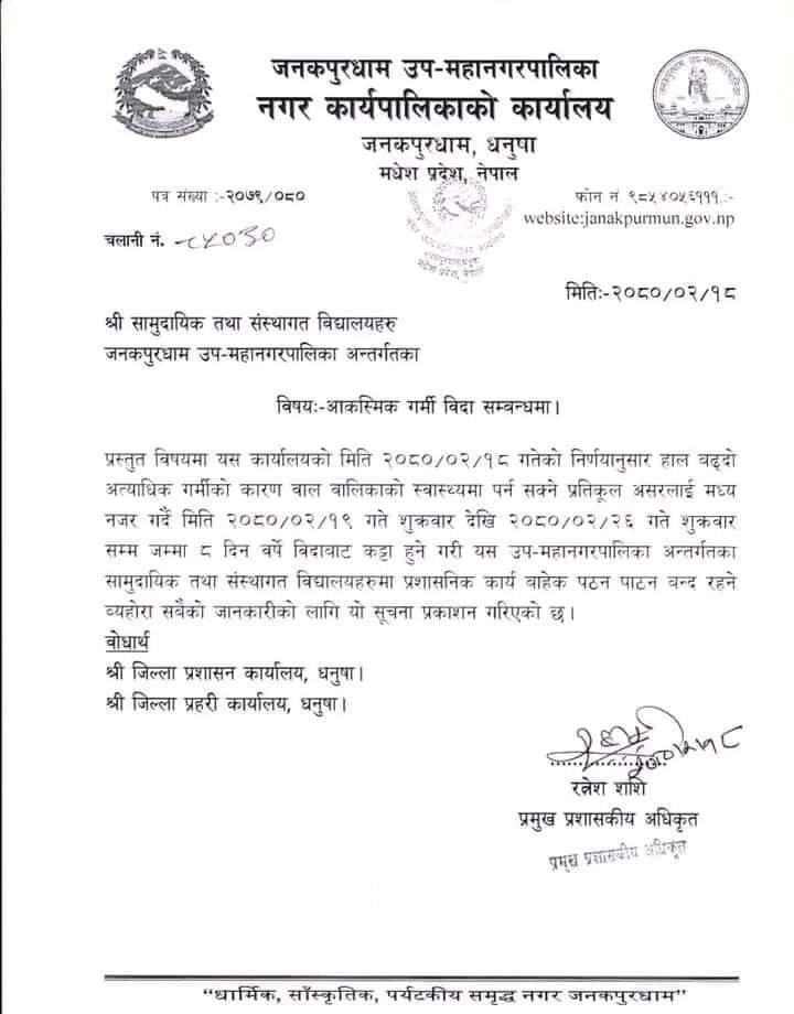 जनकपुरधाम, १८ जेठ । जनकपुरधाम उपमहानगरपालिकाले जनकपुरधामका सामुदायिक तथा संस्थागत विद्यालयहरु ८ दिनका लागि बन्द गरेको छ ।