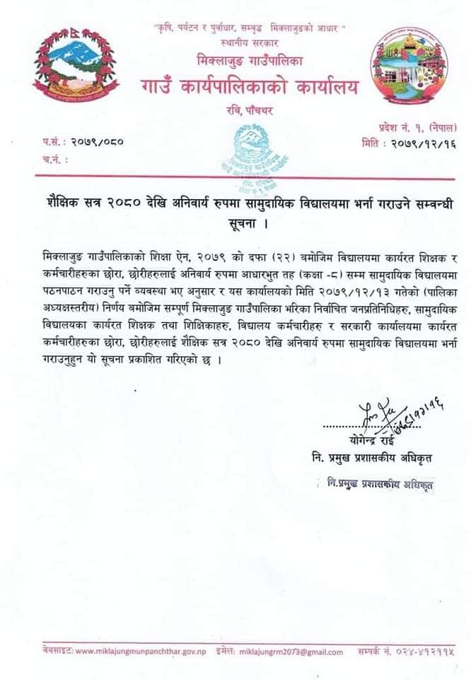 जनप्रतिनिधि र शिक्षक–कर्मचारीका छोराछारी सरकारी स्कुलमा पढाउन सूचना