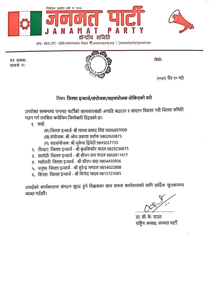 मधेशमा तोक्यो जनमत पार्टीले इन्चार्ज